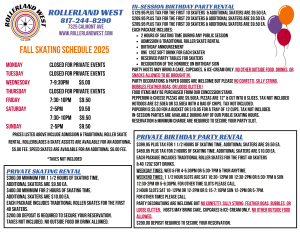 - Traditional skate rental is included with your party. Rollerblade rental and skate assists are $5.00 additional cost plus tax. Please advise us if you are paying this fee for your guests.