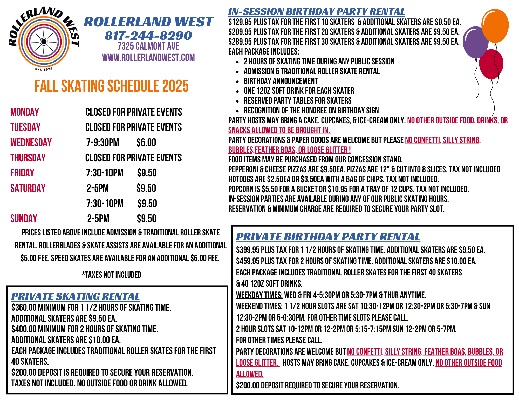 Join us for your next party here at Rollerland West! You take care of the invitations and we take care of the food and entertainment.